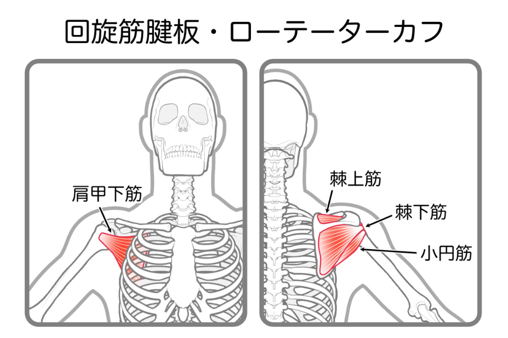 棘上筋・棘下筋・小円筋・肩甲下筋(けんこうかきん)の4つをまとめて「ローテーターカフ」と呼びます。