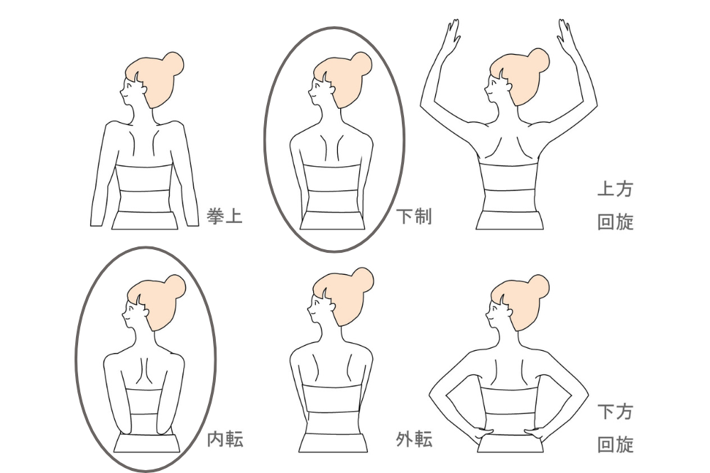硬いと肩を下方・内側へ引き、腕を背中側に回す可動域を狭くします。