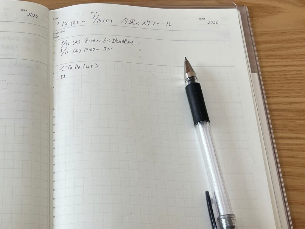 「3/9 – 3/15」のように、そのページの期間を記入。日付フリーだからこそ、自分の好きなタイミングでスタートできます。