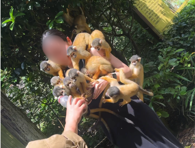 リスザルへの餌やり体験(300円くらい?)ができるのですが、この時リスザルたちがすごい勢いで体によじ登ってきます。